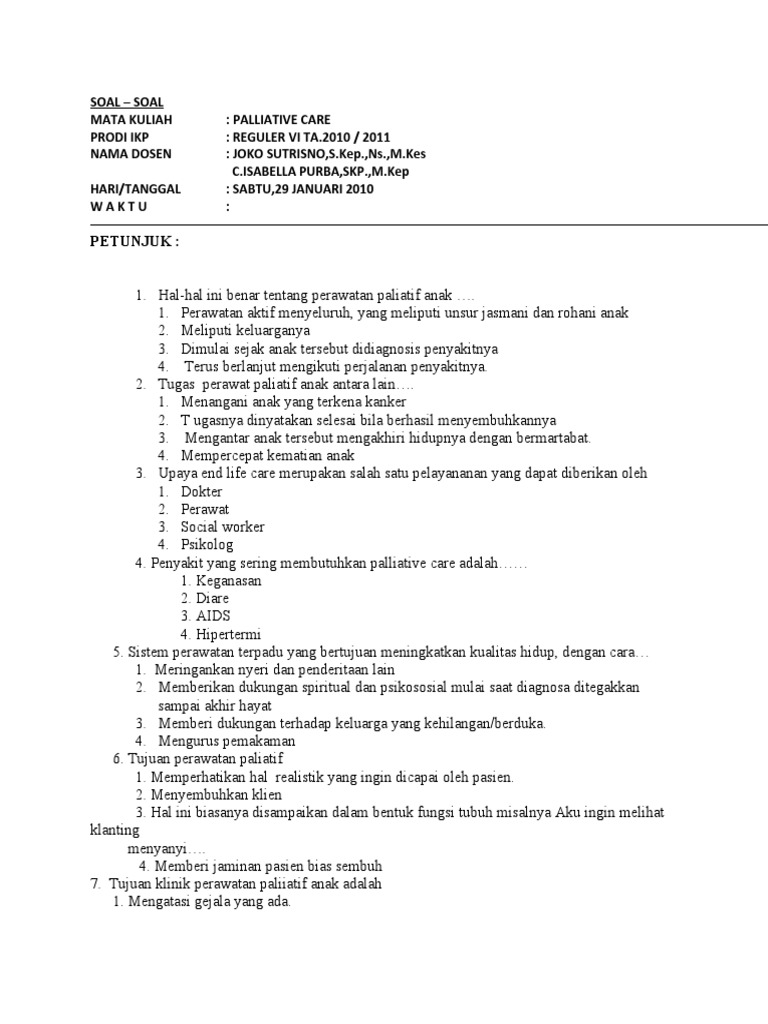 Contoh soal uts pasien terminal dan paliatif care dan ajal. 20110129 Sensitif pada pasien dan keluarga 4. MAKALAH KONSEP KEPERAWATAN PALIATIF DAN MENJELANG AJAL DISUSUN OLEH KELOMPOK 2 1. 20210313 Soal UAS Kep.